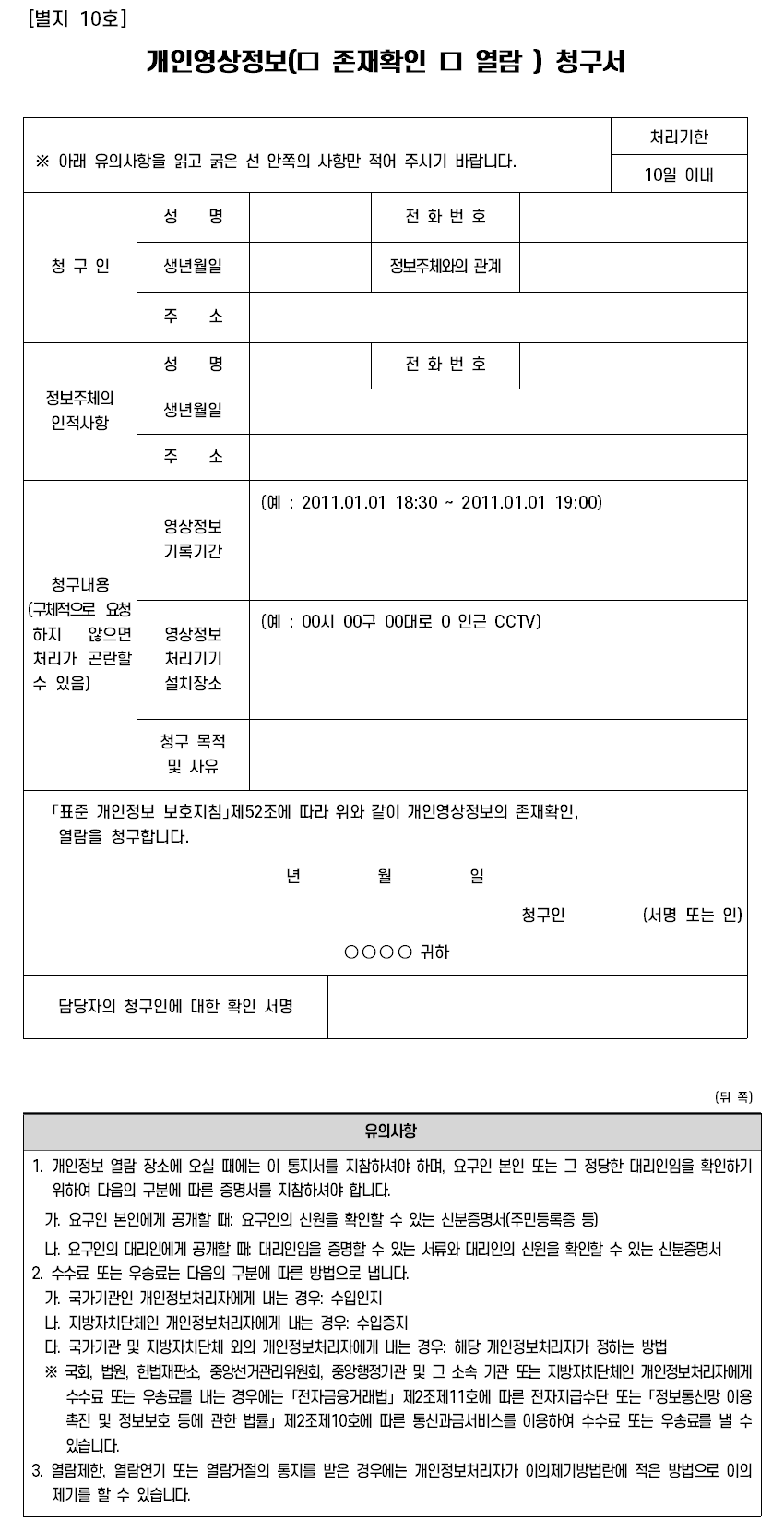 - 처리기록의 보관 및 위조‧변조 방지를 위한 조치 (개인영상정보의 생성 일시 및 열람할 경우에 열람 목적‧열람자‧열람 일시 등 기록‧관리 조치 등)